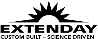 DM0000: The mark consists of of a design of a sun wth rays over the word "EXTENDAY'' in a stylized font wth the wording "CUSTOM BUILT - SCIENCE DRIVEN" underneath in a stylized font.