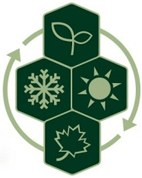 - DM0000: The mark consists of four dark green hexagons trimmed in light green one on top and one on the bottom with two side by side in the middle. A branch with two leaves in light green outline appears in the center of the top hexagon and a light green snowflake and light green sun appear in the middle two hexagons respectively and a single leaf outlined in light green appears in the bottom hexagon with the entire design encircled by two light green arrrows.