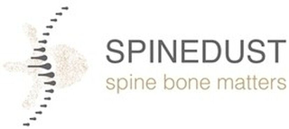 DM0000: The mark consists of a succession of lines of unequal length in gray (Pantone 424C) representing a spinal column, superimposed on a dotted orange image (Pantone 7563C) representing an upper view of a lumbar vertebra, with two inscriptions on the left: "SPINEDUST" in uppercase grey font (Pantone 424C) and underneath, "SPINE BONE MATTERS" in lowercase orange font (Pantone 7563C).