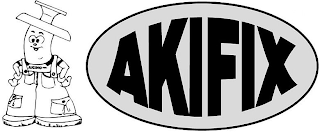 - DM0000: The mark consists of the word "AKIFIX" written in special characters inside an oval frame with a shaded background, associated with the stylized drawing of a little man in working clothes with the term Akino placed inside his overalls.