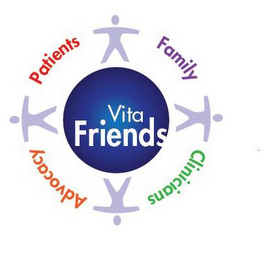 DM0000: The mark consists of the words "VITA FRIENDS" in stylized letters inside a circle. Outside the circle appear four human standing figures, one above the circle, one below the circle, one on the left side of the circle and another one on the right side. Between the human figures appear the words "PATIENTS, FAMILY, CLINICIANS, ADVOCACY" also in stylized letters. The color blue appears in the circle. The color white appears in the words "VITA FRIENDS". The color grey appears in the standing human figures. The color red appears in the word "PATIENTS". The color purple appears in the word "FAMILY". The color green appears in the word "CLINICIANS". The color orange appears in the word "ADVOCACY".