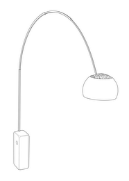 - DM0000: The mark consists of a three-dimensional configuration of a floor lamp including a rectangular cuboid base with a small footprint, a single-piece arcing arm, and a hemispherical lamp fixture with ornamental holes.