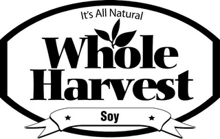 DM0000: The mark consists of a 4-sided design with its upper and lower sides curved with the wording "IT'S ALL NATURAL WHOLE HARVEST SOY", with a plant extending upward from the word "WHOLE" and the word "SOY" and two stars within a ribbon.
