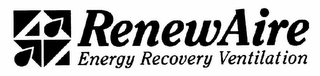 DM0000: The mark consists of a stylized design element of a diamond within a square, the superimposition of which creates a multitude of triangles within the entire design element. Superimposed on this design element are two stylized raindrops that appear to fall from a 45 degree angle proceeding to the 225 degree angle. To the right of this stylized design is the stylized text "RENEWAIRE" located above the stylized text "ENERGY RECOVERY VENTILATION".
