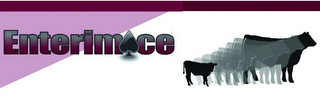 - DM0000: The mark consists of the wording "ENTERIMACE" in grey turning into dark purple from top to bottom and outlined in black. A design of a spade in black with grey and white highlighting forms the letter "A" in the wording. The wording is partially superimposed on a purple triangle. On top of the triangle is a long rectangle in dark purple and maroon. To the right of the wording is a design of multiple cows starting as one small black cow gradually increasing in size and appearing as grey cows and finally becoming one big black cow.