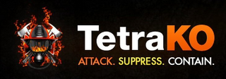 DM0000: The mark consists of the following: black background with a gray, black and red fire fighter's helmet and a black and gray gas mask with orange and yellow flames reflecting off of the mask with two white and gray axes crossed extending behind the helmet and gas mask with red, yellow and orange flames in the background next to the stylized word "TETRAKO", where "TETRA" appears in white and "KO" appears in orange. The word "TETRAKO" appears above the stylized words "ATTACK. SUPPRESS. CONTAIN.", where "ATTACK." appears in orange, "SUPPRESS." appears in yellow, and "CONTAIN." appears in white.