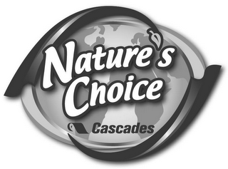 - DM0000: The mark consists of the wording "NATURE'S CHOICE CASCADES" superimposed on a globe with continents with a band with a leaf at the end placed above the term "NATURE'S" and a band with a roll of paper at the end placed below the word "CASCADES".