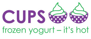 DM0000: The mark consists of the word "CUPS" in a purple color next to two cups containing yogurt, with each cup being purple with white polka dots and with the yogurt in each cup being white with green swirl lines, and underneath these the words "frozen yogurt - it's hot'' in a green color.