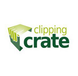 - DM0000: The mark consists of the term "CLIPPING" in light green, stylized lettering directly above the term "CRATE" in green, stylized lettering. Directly to the left of the lettering is a three-dimensional drawing of a portion of a cube having two complete sides and two partially completed sides. An abstract drawing of a hand in light green hangs over the top side of the cube-shaped drawing. The remaining portion of the cube-shaped drawing is colored green. The color white is intended to indicate background, outlining, shading or transparent areas and is not part of the mark.