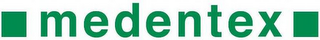 - DM0000: The mark consists of the word "medentex" with a square on each end of the word, in green.