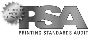 DM0000: The mark consists of "CERTIFIED WITH HONORS" on a seal design to the left of "PSA" stacked over "PRINTING STANDARDS AUDIT".