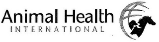 DM0000: The mark consists of the stylized words "ANIMAL HEALTH INTERNATIONAL" appearing to the left of a partially complete globe having meridians of longitude and parallels of latitude, over which is a silhouette of a right-facing horse's head and dog's head and a left-facing cow's head.