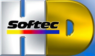 - DM0000: The mark consists of the word "Softec" in black and white above a rectangle with the colors of the rainbow, starting with yellow on the left and continuing through orange, red, and violet in the middle, and blue on the right, all superimposed over the big block letters "H" in white and "D" in yellow. The light blue color is background and not part of the mark.