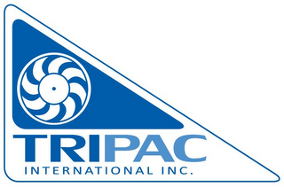 DM0000: The mark consists of thin blue border forming a triangle, a smaller blue triangle appears inside with a stylized fan in white and blue in the center, below the inside triangle appears the wording "TRIPAC" with the first three letters in dark blue and the last three letters in blue, the wording "INTERNATIONAL, INC." appears in blue below "TRIPAC".