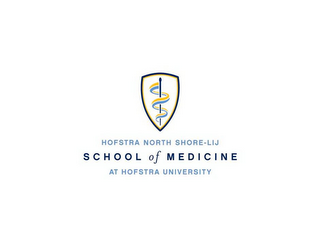 DM0000: The mark consists of the light blue words "Hofstra North Shore-LIJ" above the blue words "School of Medicine" above the light blue words "at Hofstra University". A white shield having a blue and yellow border appears above the wording. Within the shield is a two-toned banner in yellow and light blue attached to a staff in a spiral fashion.