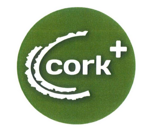 - DM0000: The mark consists of the term "CORK" followed by the plus symbol as a superscript, both in white. To the left of the term "CORK" are two jagged overlapping brackets, in white. All the aforementioned elements are contained within a green circle background.