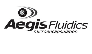DM0000: The mark consists of the wording "AEGIS FLUIDICS" with a design above the wording consisting of a shaded circle with holes inside the circles in the shape of a diamond. The circle is inside another circular band. To the right of the circle are two curved bands next to each other. Below the wording is the wording "microencapsulation" in lower case letters.