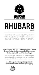 19 36 ART IN THE AGE RHUBARB (TEA) CERTIFIED ORGANIC NEUTRAL SPIRITS WITH RHUBARB & OTHER BOTANICALS NATIVE TO RURAL NORTH AMERICA. ORGANIC INGREDIENTS: RHUBARB, BEETS, CARROTS, LEMON, PETITGRAIN, CARDAMOM, PINK PEPPERCORN, CORIANDER, VANILLA AND PURE CANE SUGAR. THIS SINGULAR SPIRIT IS BASED ON AN OLD PHILADELPHIA RECIPE FOR RHUBARB TEA THAT BEGAN IN THE LATE 1700S WHEN BENJAMIN FRANKLIN FIRST INTRODUCED RHUBARB TO AMERICA. A DELICIOUS PART OF THE ORGANIC EXPERIENCE IS OCCASIONAL SEDIMENT. SHAKE WELL BEFORE ENJOYING. USDA ORGANIC