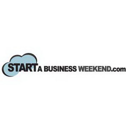DM0000: The mark consists of the words "START A BUSINESS WEEKEND" in capitlized block letters and the word ".com" in lower case block letters. The words are written horizontally with "START" followed by "A BUSINESS WEEKEND.com" "START" is in a larger font than "A BUSINESS WEEKEND". "A BUSINESS WEEKEND" is larger than ".com". The words "START A BUSINESS" and ".com" are in black. The word "WEEKEND" is in dark grey. The word "START" is positioned within a sky blue stylized cloud which is outlined in black line graded to grey. The outline of the cloud begins below the first "T" in "START" and ends at the second "T" in "START". The interior of the cloud is sky blue with the "ST" of "START" wholly in the blue field with the "ART" of "START" partially in the blue field.
