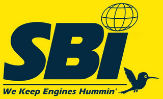 DM0000: The mark consists of bold sans serif letters "SBi" with a globe as the dot on the "i" and a hummingbird to the lower right, along with the phrase "We Keep Engines Hummin'" all in blue on a yellow background.