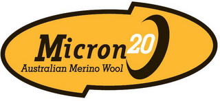 DM0000: The mark consists of the word "MICRON" in black with the number "20" in white to the right of it, and the words "AUSTRALIAN MERINO WOOL" in black underneath it. The number "20" is surrounded by a black crescent. All of the foregoing is inside of a stylized oval with a black outline and a yellow interior.