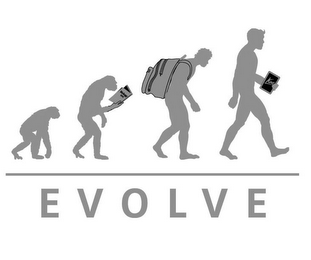 - DM0000: The mark consists of a depiction of a four figure evolution of man with the first figure shown as an ape-like figure that walks with both hands and feet, the second figure shown is walking on two feet and holding a book, the third figure shown is walking but is hunched over by the weight of a backpack, the fourth figure shown is modern man holding a rectangular tablet with the mark "KNO" underscored, and a horizontal line and the word "Evolve" directly underneath.