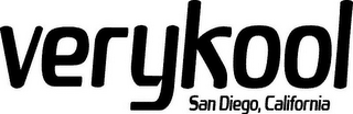DM0000: The mark consists of the word "verykool" in stylized lowercase letters, appearing above the words "San Diego, California", also in stylized letters, with "San Diego, California" appearing in a significantly smaller size and with normal capitalization.