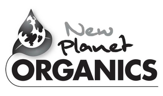 - DM0000: The mark consists of the words "New" and "Planet" in a font that appears handwritten above the word "Organics" in all capital letters, with a design element consisting of a drop on a leaf, positioned to the left of the words ""New Planet" and above the word "Organics", with a line extending from the bottom of the leaf to curve around and underline the word "Organics".