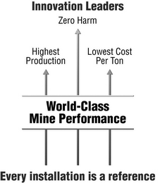 DM0000: The mark consists of the words "Innovation Leaders" with the words "Zero Harm" directly below and centered with the words "Highest Production" over an arrow to the left with another arrow in the center directly under the words "Zero Harm" with the words "Lowest Cost Per Ton" over an arrow to the right with a straight line above and below the centered words "World-Class Mine Performance" with the bottom of the three arrows directly below the bottom straight line and the words "Every installation" is a reference centered below the bottoms of the three arrows.