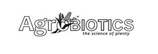 DM0000: The mark consists of two-rowed literal elements "AgroBIOTICS" in the upper row and "the science of plenty" in the lower row. "AgroBIOTICS" is shown in a larger letter size than that of "the science of plenty." Stylized wheat, corn on a cob, rice, and leaves are combined with the first letter "O" of "AgroBIOTICS".