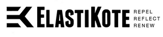 DM0000: The mark consists of an image created by a combination of block-style letters "E" and "K" with the word "ELASTIKOTE" in large lettering to the right of that image and then the words "REPEL", REFLECT", and "RENEW" in smaller lettering vertically stacked to the right of the word "ELASTIKOTE".