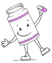 - DM0000: The mark consists of a character in white and black in the form of a pill container having arms and legs with pink stripes on the body holding a pill that is white and pink outlined in black.