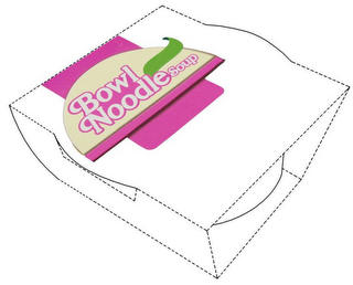 - DM0000: The mark consists of a configuration of a three dimensional box with rounding in the middle. The solid lines depict the rounded edges of the box, which are claimed as part of the mark. The dotted lines depict portions not claimed as a part of the mark. The terms "BOWL NOODLE SOUP" appear in white stylized print with a fuchsia outline in a beige colored half circle with a vertical fuchsia rectangle in the background. To the right of these words is a green colored ribbon.