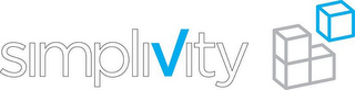 - DM0000: The mark consists of the word "SIMPLIVITY" in white with the "V" stylized form and in the color blue, with its right side higher than its left side, all to the left of four cubes where one cube in the color blue is separated from the remaining three cubes in gray, which if combined would form a larger cube. The black in the word "SIMPLIVITY" is used as outlining and is not a feature of the mark.