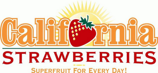 DM0000: The mark consists of the word "California" in orange with a green line underneath, with a red strawberry with a green stem and yellow seeds as the "O". A yellow sunburst is behind the strawberry. Underneath the green line is the word "STRAWBERRIES" in red. Underneath the "B" in "STRAWBERRIES" is a yellow line in between two yellow dots. Underneath "STRAWBERRIES", in orange, are the words "SUPERFRUIT FOR EVERY DAY!".