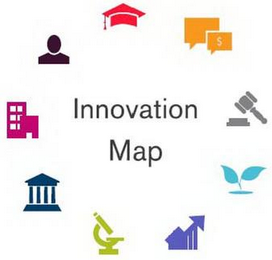 - DM0000: The mark consists of the wording "INNOVATION MAP" in black lettering surrounded by various technology icons arranged in a circle. From the top, the icons are a red graduation mortarboard, orange speech clouds, a gray gavel, a blue plant, a purple arrow, a green microscope, a blue courthouse, a magenta building, and a black stylized human bust.