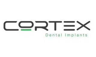 - DM0000: The mark consists of "CORTEX DENTAL IMPLANTS" with the term "CORTEX" in the color black and the terms "DENTAL IMPLANTS" in the color green; under the letter "O" in "CORTEX" is a green underscore.