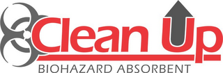 DM0000: The mark consists of the words Clean Up in the color red, and the words Biohazard Absorbent in the color grey. There is a divider in-between the words Clean Up and the words Biohazard Absorbent. There is a gray arrow pointing upwards inside of the letter U of the word Up. There is a partial Biohazard Symbol in gray alongside the letter C in the word Clean. The Words Clean Up is bolded while the words Biohazard Absorbent is not.