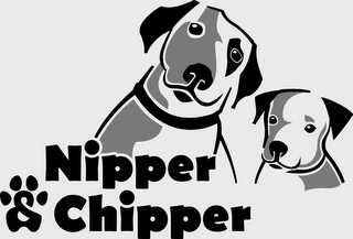 - DM0000: The mark consists of two dogs, one large and one small, with dark ears, eyes, noses, and collars behind the stylized phrase "NIPPER & CHIPPER" to the right of a stylized paw print.