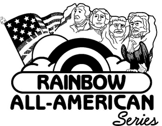 DM0000: The mark consists of a flag with stars and stripes with an eagle on the top of the flag pole, next to a stylized depiction of Mount Rushmore, all above a stylized depiction of a rainbow and clouds, all above the literal element "RAINBOW" in an oval border, all above the literal element "ALL-AMERICAN", all above the literal element "SERIES".