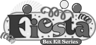 - DM0000: The mark consists of the literal element "FIESTA" in an oval border surrounded by confetti and balloons, all above the literal elements "BOX KIT SERIES" in an oval border.