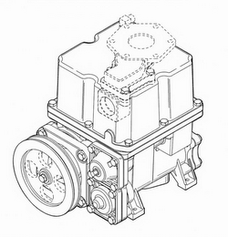 - DM0000: The mark consists of the product configuration of a pumping mechanism made from aluminum castings with aluminum, iron, brass, steel, composite and plastic parts. The pumping mechanism includes a bottom casting and a top cover casting. The bottom casting having a large diameter iron pulley with spokes located at the lower left section of the front, a bypass valve cover located in the lower right corner of the front, a control valve cover located directly above the bypass valve cover, a flange extending around the upper extent of the bottom casting, and legs protruding from the bottom of bottom casting. The bypass valve cover has a square shape with a cylindrical protrusion, and has for hex head fasteners located at the four corners of the square shape. The control valve cover has a square shape with a conical protrusion, and has for hex head fasteners located at the four corners of the square shape. The upper casting includes a generally flat substantially square upper surface having notches at the corners and middle of each side, side walls extending downward from the four sides of the substantially square upper surface, and a flange along a bottom extent of the top cover casting for abutting against the flange of the bottom casting and for receiving hex head fasteners that secure the bottom and top cover castings. The side walls have grooves corresponding to the notches in the upper surface and the hex head fasteners being located along these grooves where they join the flange. The top cover casting consists of approximately 50 percent of the assembled pump mechanism. An optional flanged meter mount on the upper surface of top cover casting is shown in dashed lines and does not form a part of the mark. An optional inlet port on the front side wall of the top cover casting is shown in dashed lines and does not form a part of the mark.