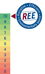 DM0000: The mark consists of the letters "R", in red, "E","E", in dark blue, inside a white circle with dark blue slanted lines above and below the letters with the words "RELIABLE - EFFICIENT - ENVIRONMENTALLY SOUND" in white in a dark blue circle surrounding the white circle with a red triangle to the left of the circle design with multicolored boxes with dark blue numbers starting with the number "10" at the top and descending consecutively in decreasing order all the way to the number "0" with the top box in green with each box color fading with each number to yellow to number "5" with each box color fading to orange to the number "0".