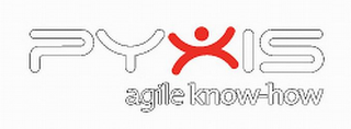 - DM0000: The mark consists of the word "PYXIS" in white letters outlined in black, the "X" is in red with a red dot thereon, and the words "agile know-how" are below in white letters outlined in black.