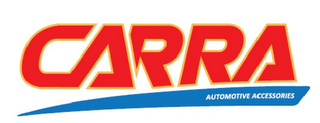 DM0000: The mark consists of the word "Carra" written in red traced with yellow on a white background, underlined in blue and the words "automotive accessories" written in white on the blue underline.
