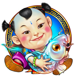 - DM0000: The mark consists of a stylized image of a child in traditional Chinese clothing holding a fish. The child has peach skin; black hair; pink cheeks and lips; brown, black, and white eyes; and a small blue design on his forehead. The child's clothing is blue, red, and purple with gold and pink designs. The child's shoes are red and gold, his bracelet is green, and his hair ties are red. The child holds a white, pink, blue, and yellow fish with a brown, yellow, and black eye. The child appears in front of a blue circle with a gold pattern around its perimeter.