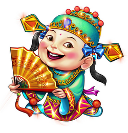 - DM0000: The mark consists of a stylized image of a child in traditional Chinese clothing holding a fan. The child has peach skin; brown, black, and white eyes; black hair; pink cheeks, tongue, and lips; white teeth; and a small pink design on her forehead. The child's clothing is green, red, pink, and blue with gold designs and her headpiece is green, yellow, and red with gold designs, a blue gem, and red circular decorations. The child's hair bows are blue and red, and her shoes are blue and purple with red circular decorations. The child holds a red and gold fan with a green and red decoration.