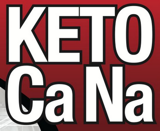 - DM0000: The mark consists of white letters with black outline that spell "KETO" across the top half of the mark on a red background. The bottom half of the mark has white letters with black outline that spell "CA NA" on a red background. The bottom left corner consists of a gray triangle with a curved hypotenuse inside a black triangle with a curved hypotenuse. Inside the gray triangle appear various horizontal, vertical and diagonal white lines. A portion of the lettering "CA" appears in front of the triangles. The white outside the triangles is not claimed as a feature of the mark.