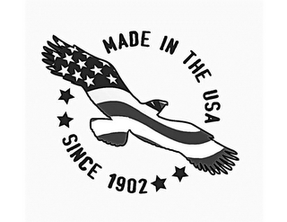 DM0000: The mark consists of the wording "MADE IN THE USA" and "**SINCE 1902**" arranged in a circular design, diagonally bisected from upper left to lower right by a representation of an eagle with outstretched wings; the eagle design is overlaid with the stars and stripes pattern of the American flag to the left wing and head containing the stars design/pattern, and the rest containing the flowing stripe pattern.