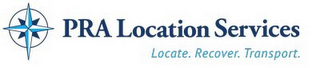 DM0000: The mark consists of artwork and words consisting of a four-pointed dark blue star inside a dark blue circle, with the dark blue star and dark blue circle underneath a white and light blue star in which the white and light blue halves run lengthwise in the points of the star. Directly adjacent to the artwork are the words "PRA Locations Services." In dark blue and below it are the words "Locate. Recover. Transport." all appearing in light blue.